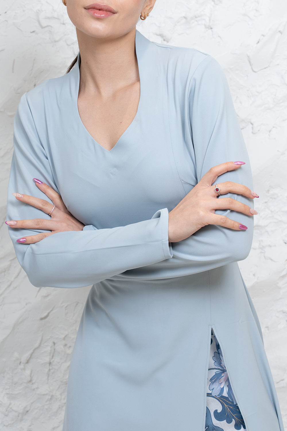 The Aurea Slit Dress blends modern elegance with fluid movement, designed for refined occasions and elevated everyday wear. Crafted in a soft blue tone, the silhouette features a clean neckline and a graceful one-side slit that reveals subtle contrast and motion with every step. The streamlined structure enhances the body’s natural lines while maintaining a modest, sophisticated presence