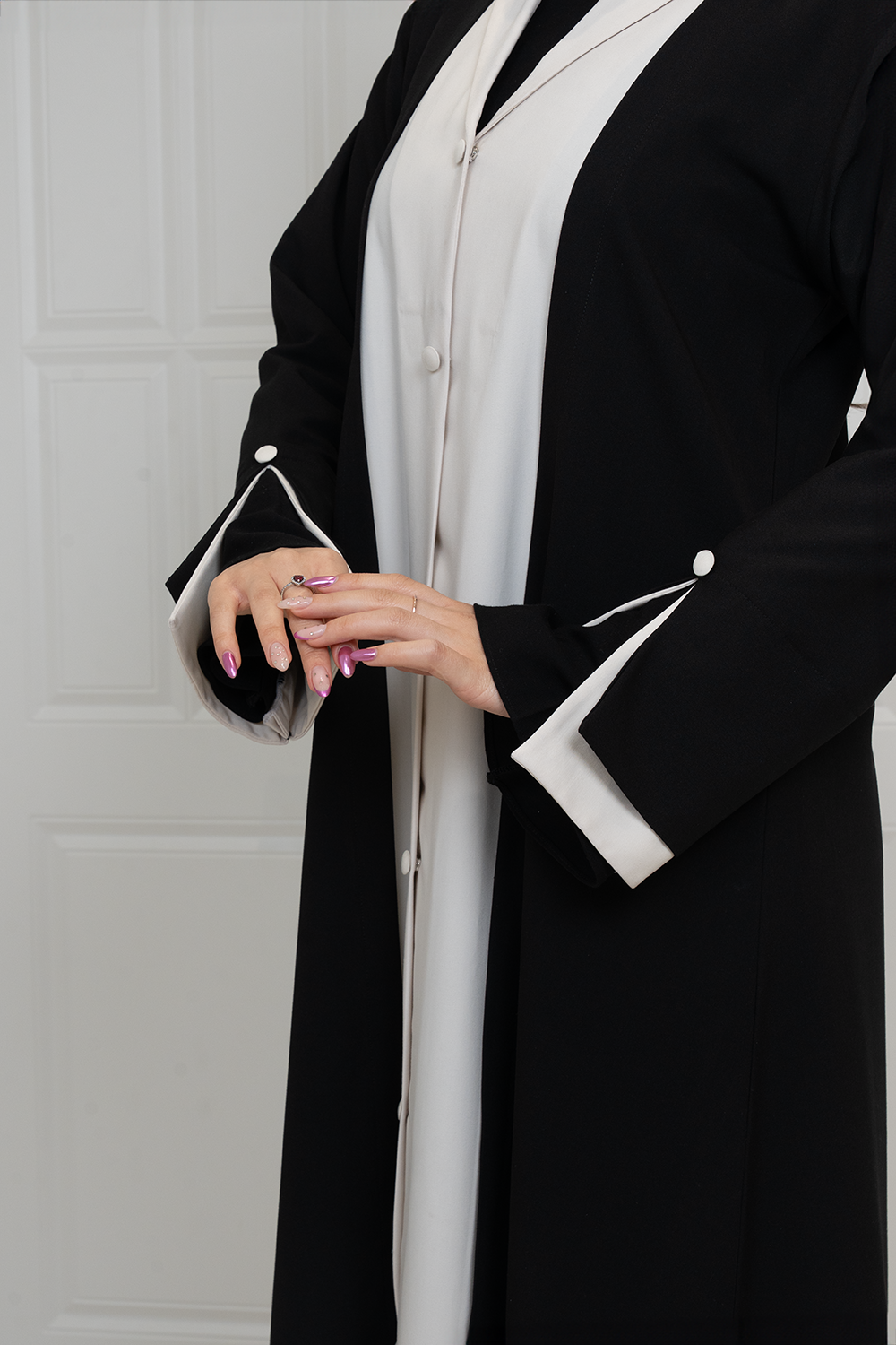 A modern longline abaya designed for refined elegance and everyday sophistication. Featuring a clean contrast panel design, the Contour Abaya creates a structured, elongated silhouette while maintaining effortless comfort. Crafted from premium sunting twill fabric, it offers a smooth tailored finish ideal for formal and office wear.
