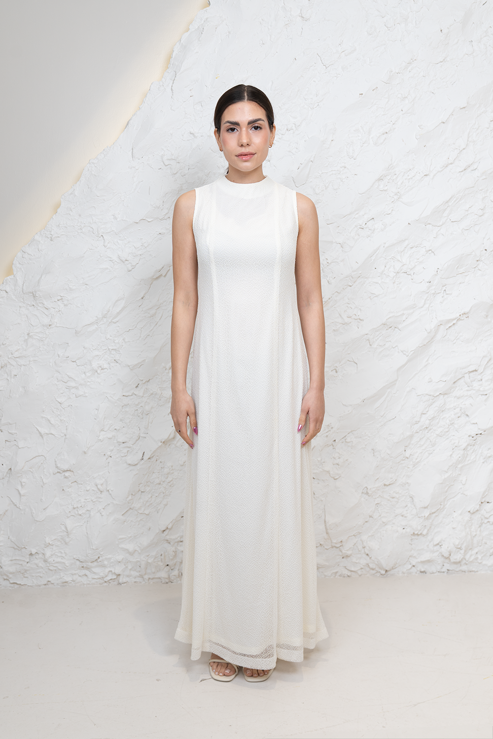 The Épure Dress reflects quiet elegance through simplicity and fluid form. Designed with a refined high neckline and a softly flowing silhouette, the piece moves effortlessly while maintaining a clean, elongated structure. Its lightweight layered texture adds subtle depth, creating an understated statement suited for modern occasion and refined everyday wear.